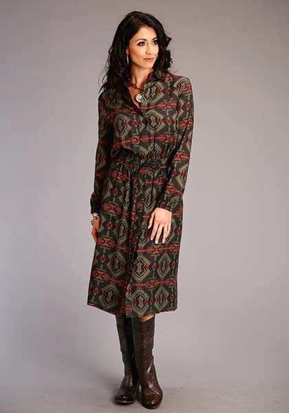 The dress features a full mid-length skirt and a hidden center front placket, providing a clean, polished look. Perfect for layering or wearing alone, this versatile piece brings a classic western flair to any casual or semi-dressy occasion.
