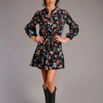 This Stetson Feather Floral Print Dress is crafted from soft 100% rayon twill and features a stand collar with a button half front placket. The gathered bubble bottom sleeves with elastic cuffs add a touch of feminine charm, while the gathered waist with self ties accentuates the figure for a flattering fit.