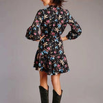 The dress falls to a slight shirt tail hemline with a subtle pleat at the center back neckline, giving it a relaxed yet elegant drape. Perfect for daytime outings, casual events, or any western-inspired ensemble, this dress combines comfort, style, and distinctive floral flair.