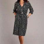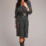 Functional side seam pockets add convenience while maintaining the dress’s sleek silhouette. Perfect for casual outings, country-inspired events, or layered with a jacket for cooler days, this versatile dress blends Western-inspired style with everyday comfort.
