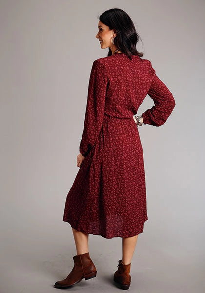 This Stetson Western Ditzy Dress is made from soft 100% rayon twill in a playful wine-colored print. The long sleeves with elastic cuffs and stand collar with V-neckline offer a comfortable, classic fit, while the elastic waist with a self-fabric tie belt provides gentle shaping and a flattering silhouette.