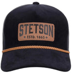 The Stetson Trucker Cap features a rich navy corduroy front panel accented with a premium leather patch and braided leather detail, giving it a rugged, classic Western look. Crafted from a cotton/poly blend, the hat offers durability and comfortable wear.