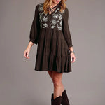 Designed with a feminine V-neck stand collar and gathered 3/4 sleeves, it features a tiered skirt that moves beautifully with every step. Subtle bust darts ensure a perfect fit, while delicate embroidery adds texture and a touch of handcrafted artistry. A timeless addition to your Stetson wardrobe.