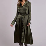 The fitted waist with front and back darts, complemented by a self-tie belt, creates a flattering silhouette, while wide cuffs with single snap closures add a refined finishing touch. Perfect for casual outings, office wear, or western-themed events, this versatile dress offers comfort and sophistication in one piece.