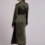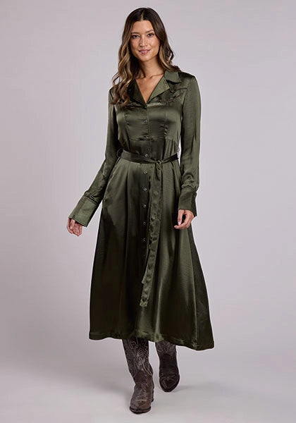 This elegant olive satin dress from Stetson’s Fall I Collection is crafted from smooth, lightweight polyester satin, giving it a polished western-inspired look. Featuring an open notch collar, single point front and back yokes, and both smile and side seam pockets, it balances style and function effortlessly.
