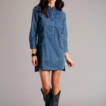 This classic medium blue denim shirt dress from Stetson's Fall I Collection offers timeless western style with a flattering fit. Crafted from 100% cotton, it features princess seams below straight front and back yokes, creating a tailored silhouette while maintaining comfort.