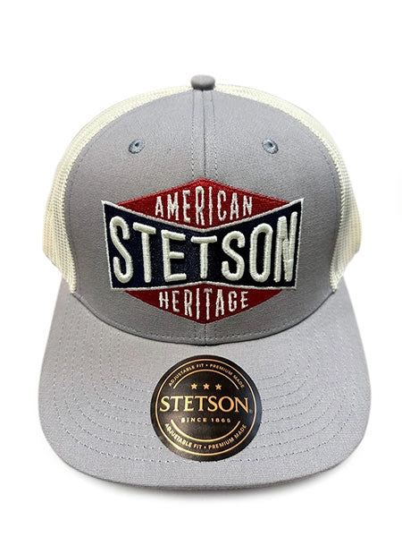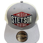 This Stetson Trucker Ball Cap features the bold American Heritage Banner embroidered patch on a versatile grey cotton/poly blend. The classic trucker silhouette includes a structured front panel and breathable mesh back for comfort and ventilation, making it perfect for all-day wear.