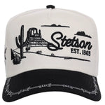This Stetson Trucker Ball Cap showcases an intricate desert scene embroidery accented with barbed wire detail, crafted on a crisp white polyester fabric. The structured front panel and mesh back provide breathability and a classic trucker fit, making it both stylish and comfortable for all-day wear.