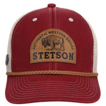 This Stetson Trucker Ball Cap features a genuine leather "Authentic Western Goods" patch with an accent leather cord, adding a touch of rugged western authenticity. The vibrant red color makes it a standout accessory for any casual or outdoor outfit.
