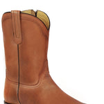 The Rancher Zip Roper in burnished cognac leather showcases a warm, rich hue that brings both elegance and rugged Western appeal. Its corded crown adds refined detail, while the side zipper provides easy access without compromising the classic silhouette. The wide R toe and 10" shaft deliver comfort and versatility for riding or casual wear.