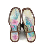 Sign of the Sun draws attention with its white variegated lazered Aztec vamp, creating a bold pattern that contrasts beautifully against the crackled brown shaft. The square toe and double welt construction provide a classic Western structure while maintaining durability.