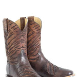 The Slash boot delivers fierce style with a rugged edge. Its ripped brown leather vamp carries a raw, broken-in character, while the waxy orange shaft is elevated by a bold embroidered tiger design. The square toe and 11-inch shaft balance modern attitude with traditional cowboy structure, creating a boot that instantly commands attention. This is a piece made to stand out, offering both artistic detail and everyday wearability.